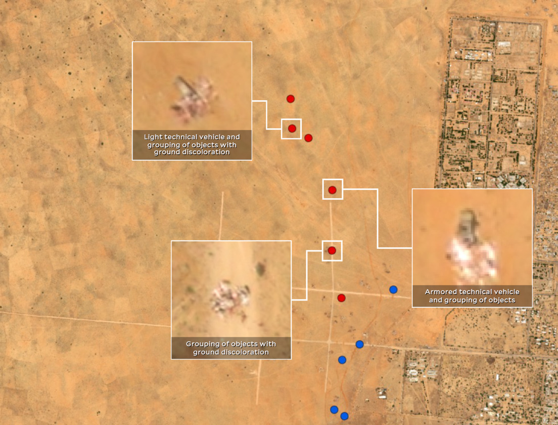 Los expertos del Laboratorio de Investigación Humanitaria, que monitoreaban el asedio de El Fasher mediante imágenes satelitales y fuentes abiertas, descubrieron posteriormente grupos de objetos "compatibles con el tamaño de cuerpos humanos sobre el suelo cerca de vehículos de las RSF", así como una "coloración rojiza del terreno", que podría ser sangre o tierra removida.